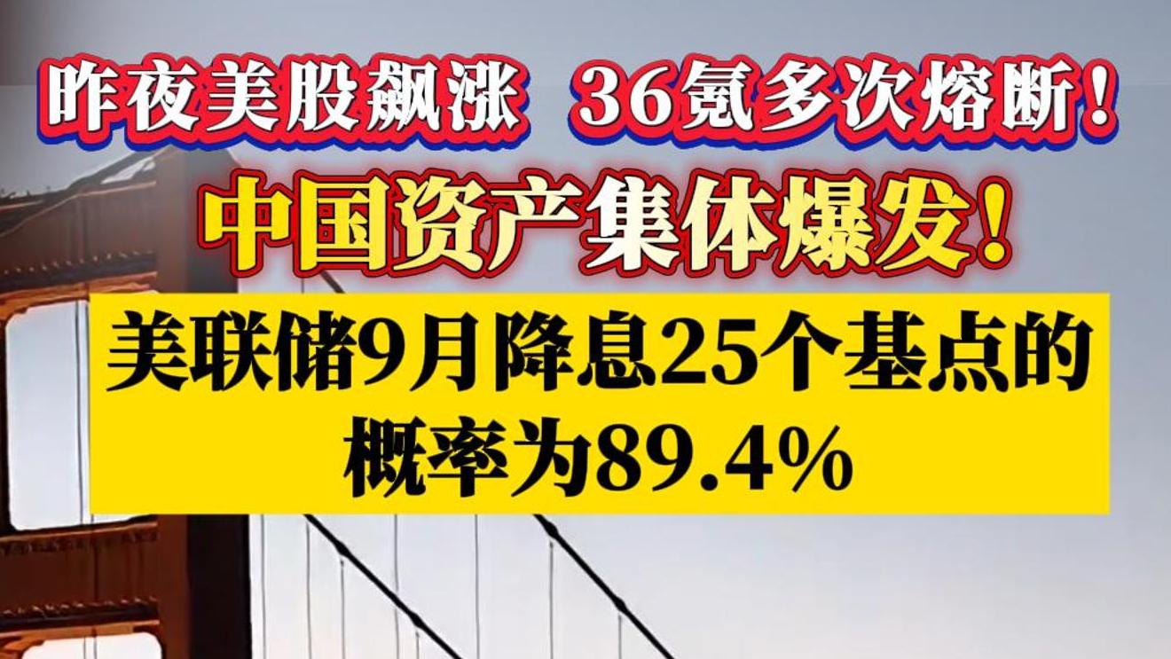 昨夜美股飙涨 36氪多次熔断! 中国资产集体爆发! 美联储9月降息25个基点的概率为89.4% #美股 #美联储 #中概股