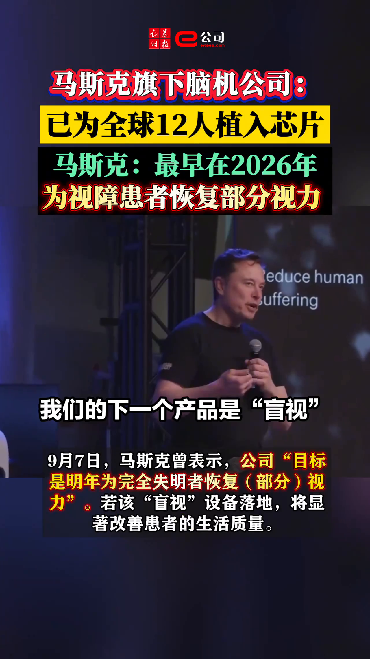 马斯克旗下脑机公司:已为全球12人植入芯片 马斯克:最早在2026年为视障患者恢复部分视力